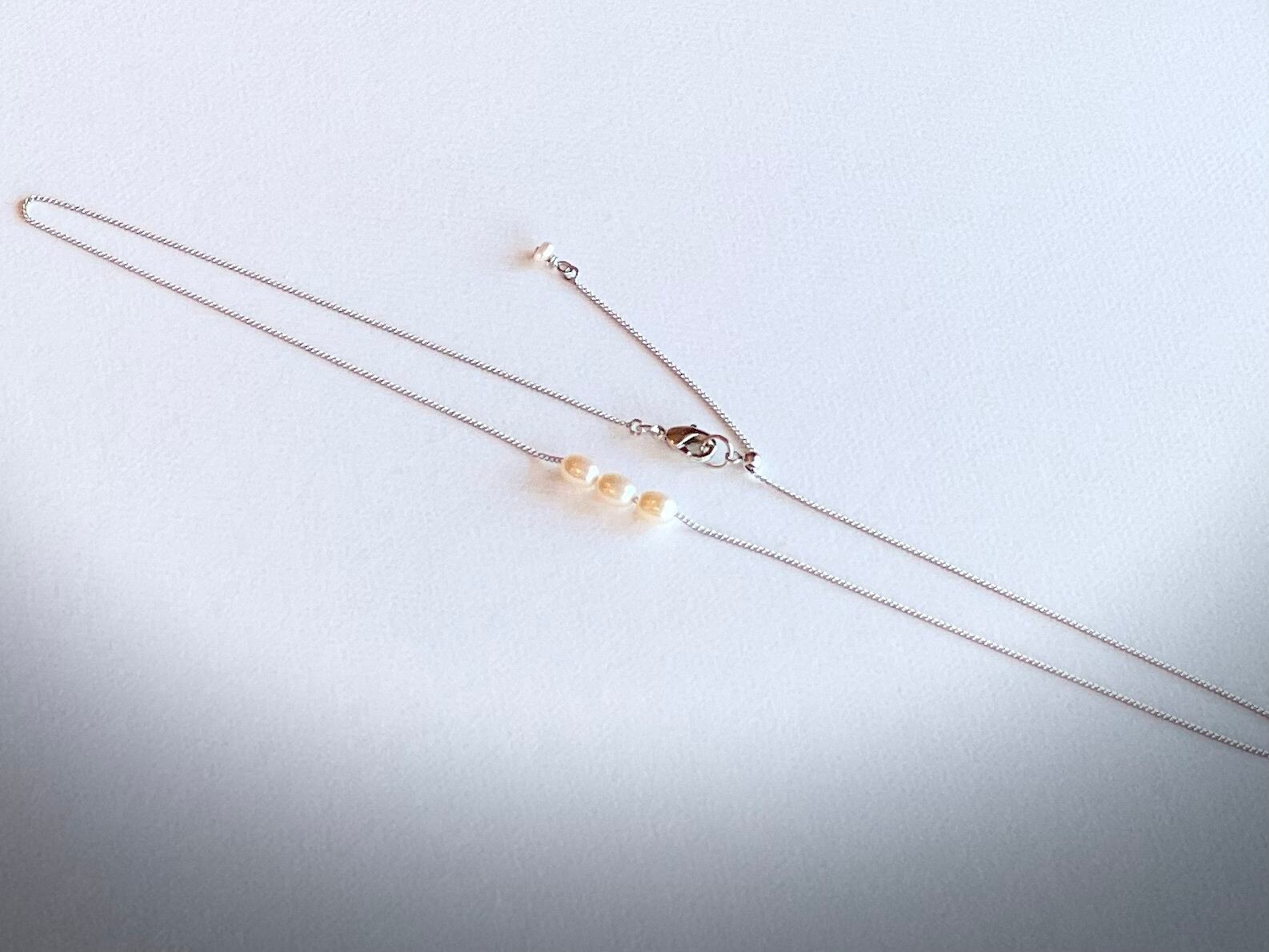 3つの整列した淡水パールが、シンプルでありながらも洗練された印象を与えるネックレスです